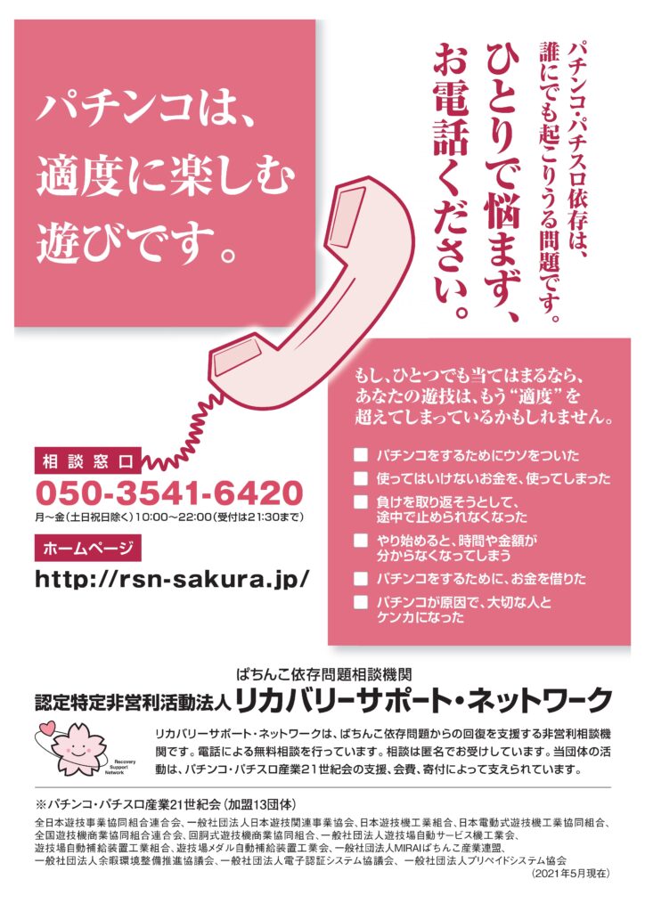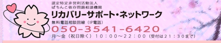 リカバリーサポート・ネットワークは、パチンコ・パチスロの遊技に関する依存及び依存関連問題解決の支援を行うことを目的に設立された非営利の相談機関です。