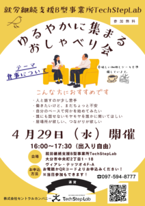 4月29日(水)に、就労継続支援B型事業所TechStepLabで「ゆるやかに集まるおしゃべり会」を開催します。
