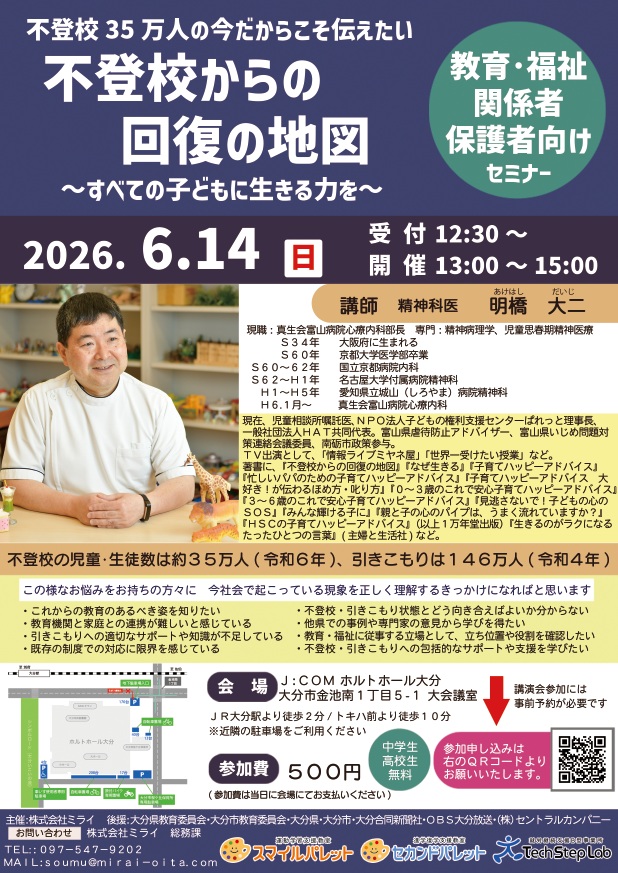 このたび 、「不登校からの回復の地図」「子育てハッピーアドバイスシリーズ」の著者であり、精神科医として長年子どもと家族の心に寄り添ってこられた 明橋大二先生 をお招きし、特別講演会を開催いたします。